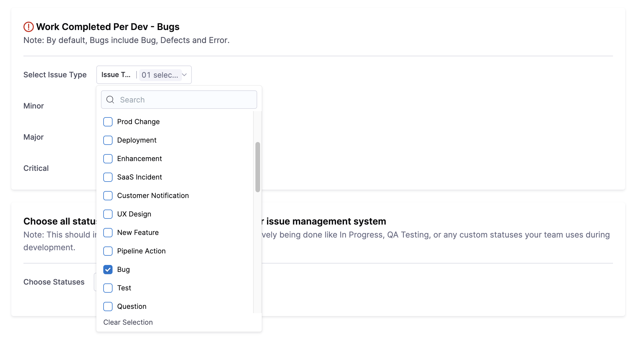 Select statuses from your issue management system that represent development phases (e.g. In Progress, Dev Testing, Ready for QA). This is used to calculate Work Completed Per Dev and contextualize effort timelines in feature delivery for every developer.