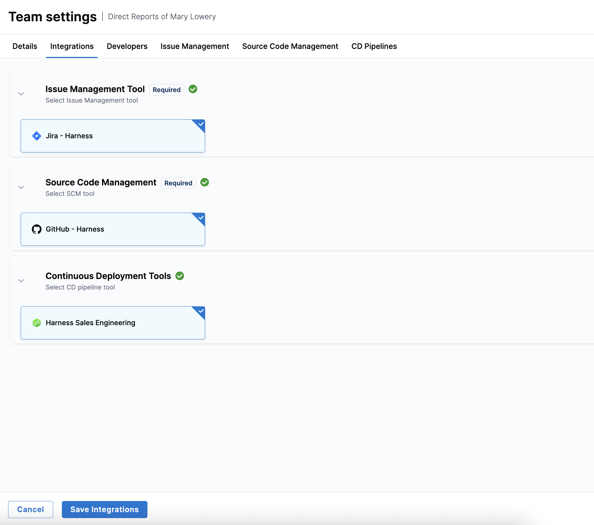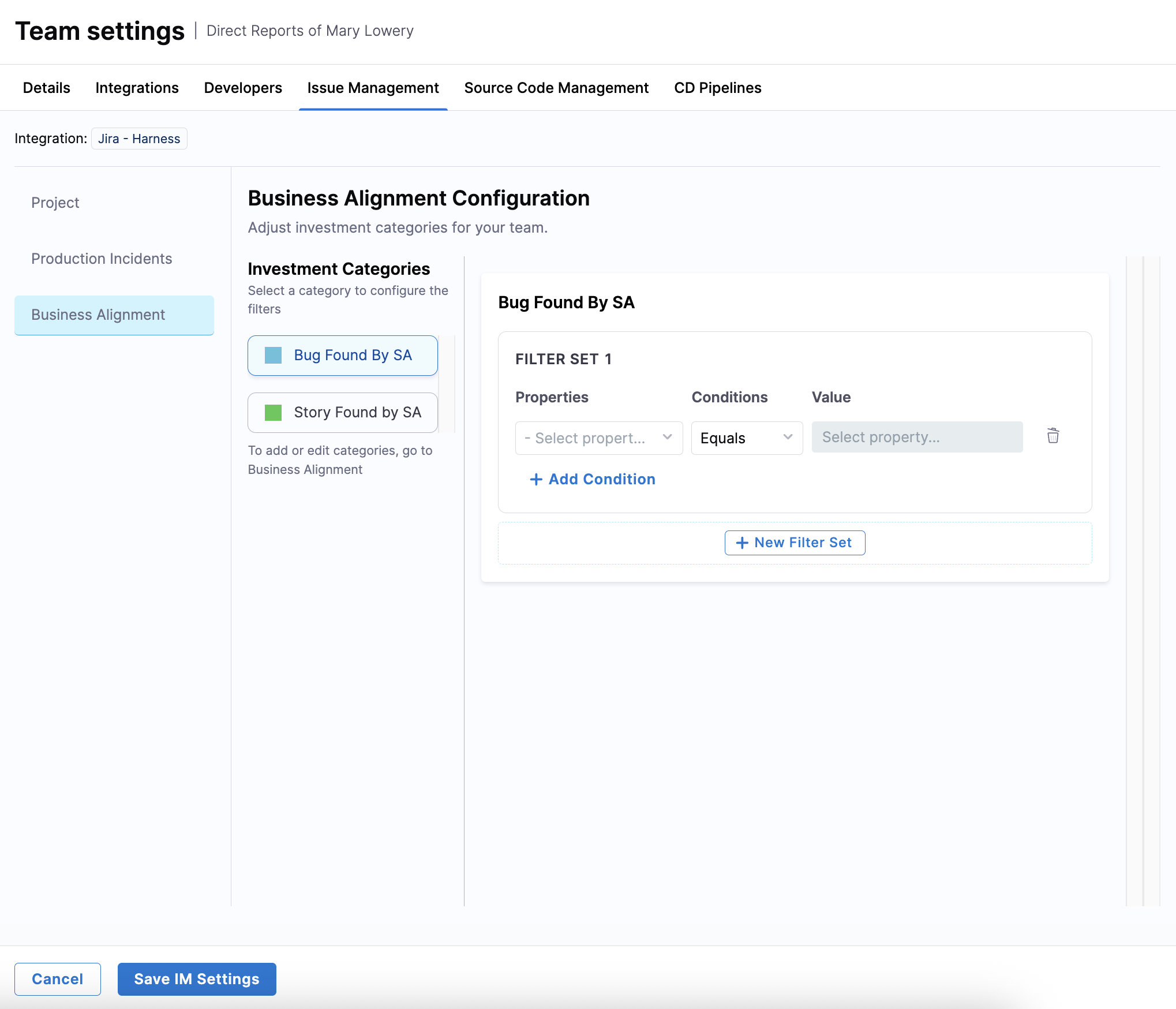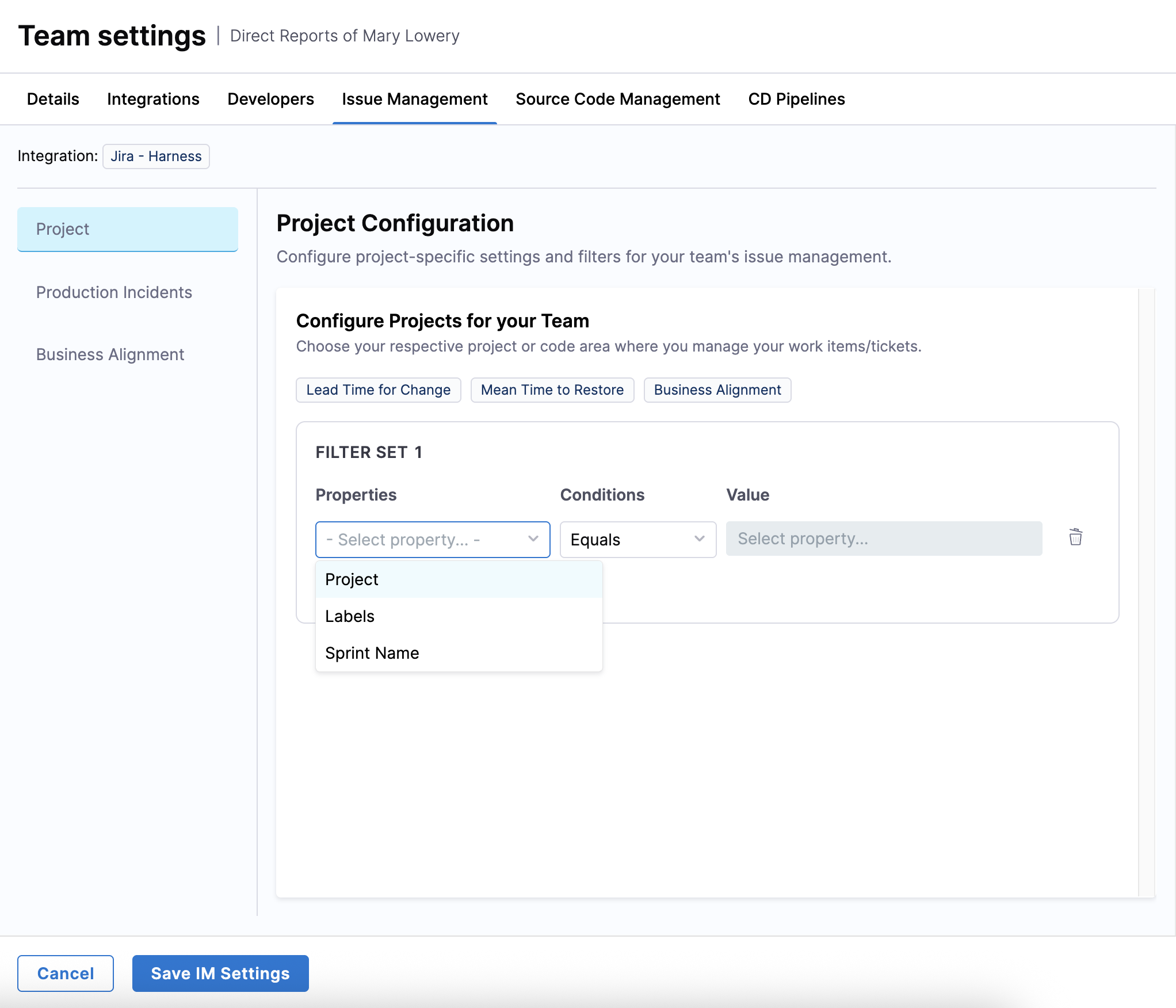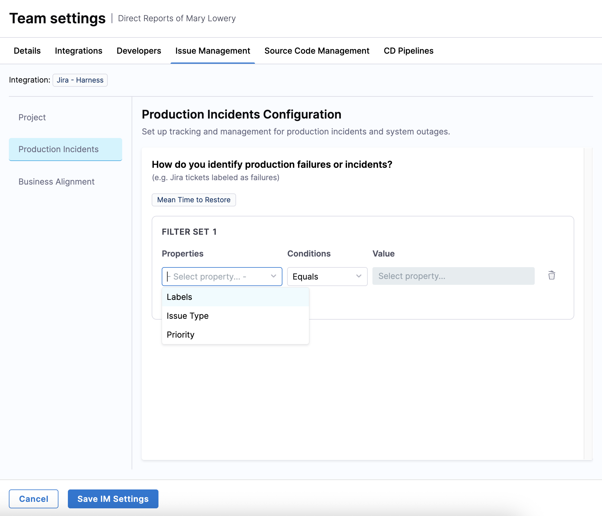 Edit the team name on the Details tab and click Save Team Details.  Select available integrations for this team on the Integrations tab and click Save Integrations.  Create a filter set by adding conditions to define criteria for your team's issue management system on the Projects tab.  Create a filter set to track production failures and incidents on the Product Incidents tab.  Create a filter set to define investment categories on the Business Alignment tab.  Once you've configured these filter sets, click Save IM Settings. Create a filter set to define the branches used for production deployments (for example, main,develop, orrelease) on the Source Code Management tab. Once you've set the target branch, click Save SCM Settings. Create filter sets to include relevant pipelines or services, define successful deployments (for example, Status Equals Success), and identify production failures (for example,Rollback Equals True) on the CD Pipelines tab. Once you've configured these filter sets, click Save CD Settings.