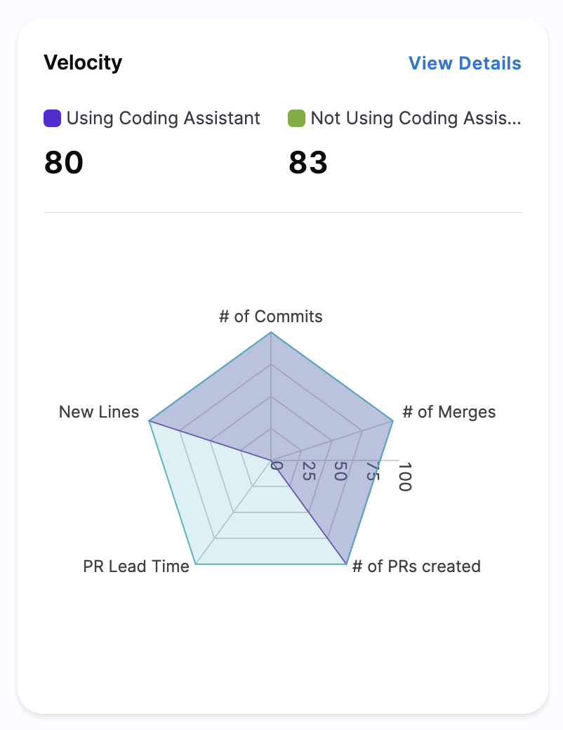 The Velocity widget provides a comparative analysis of key engineering productivity metrics for cohorts i.e. teams using Coding Assistant vs. not using Coding Assistant. This widget captures critical data points that influence software delivery speed and efficiency, including: