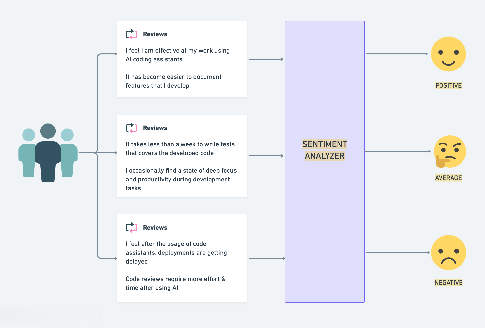 Sentiment analysis evaluates the perceptions and feelings of developers toward the developer experience where AI code assistants may impact.It helps measure aspects like ease of use, satisfaction, productivity, and innovation.