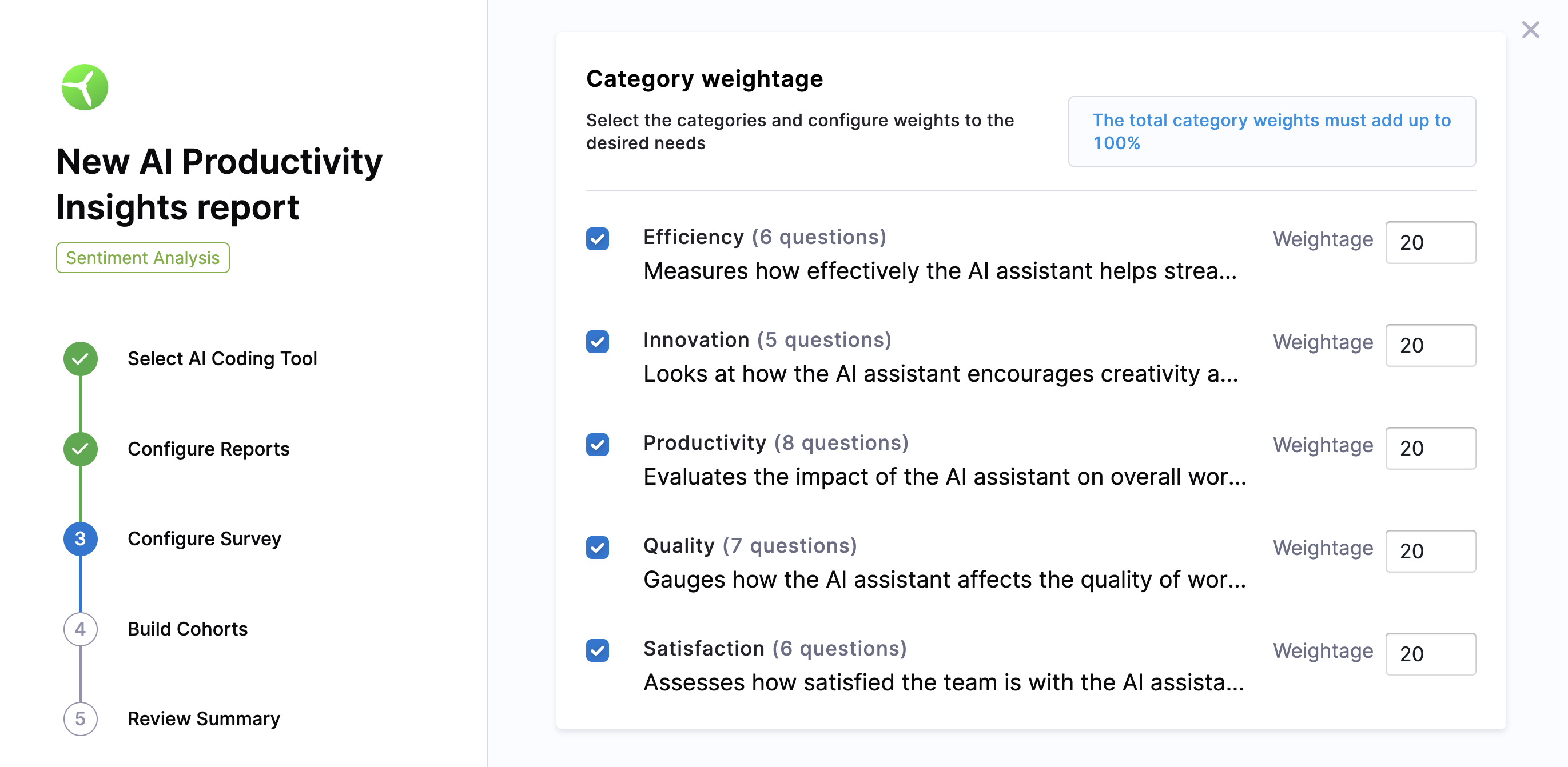 Configure categories to reflect your priorities. Assign a total weight of 100% across all categories. The assigned weight will be considered while calculating the category scores as well as the overall productivity boost.