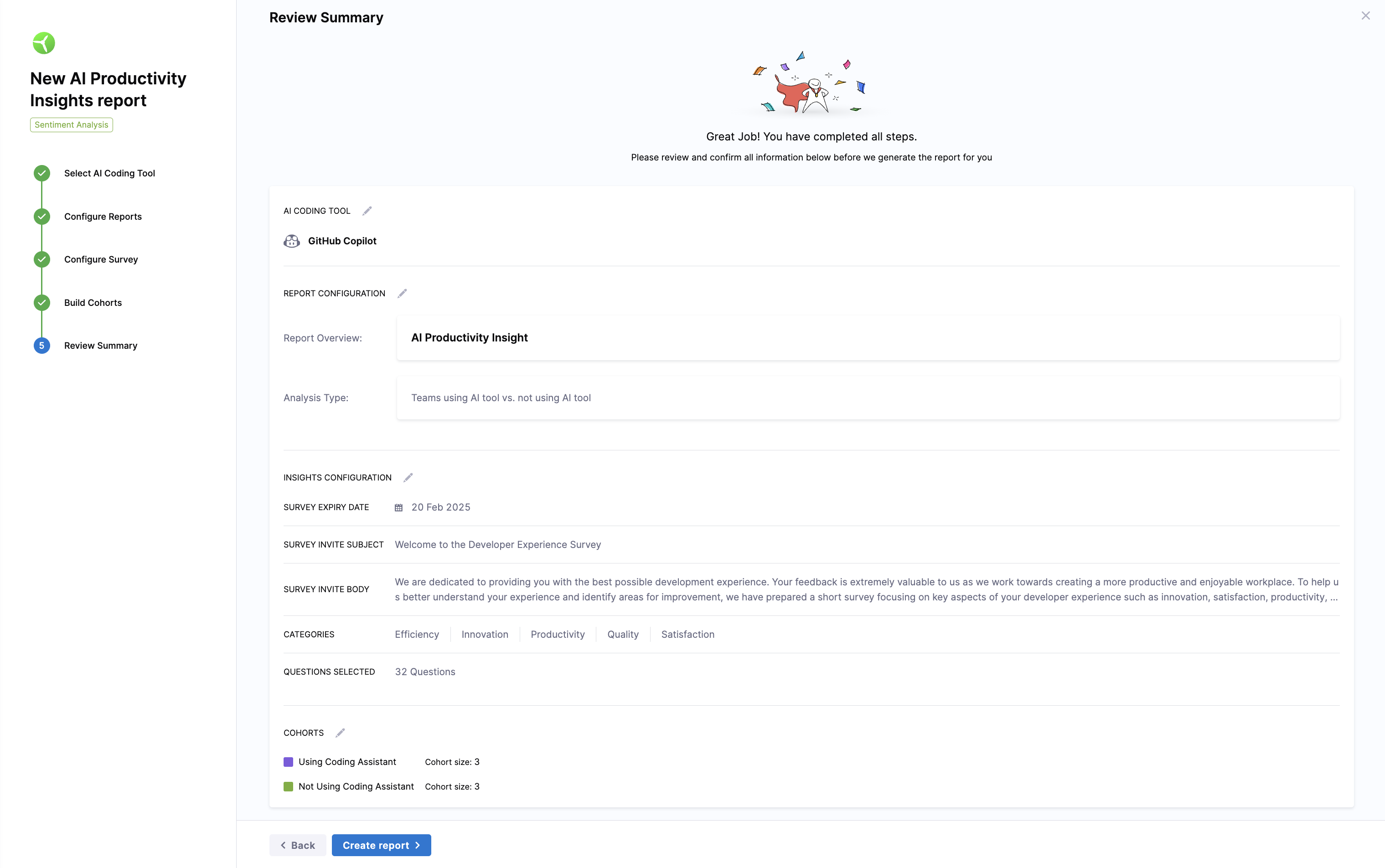 - Quick feedback loops: When you need to quickly assess how AI tools are impacting your developers' experience and performance.