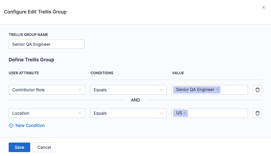 - Click on Add Trellis Groups to create a unique group and define matching criteria for identifying users based on custom contributor attributes like RoleandLocation.