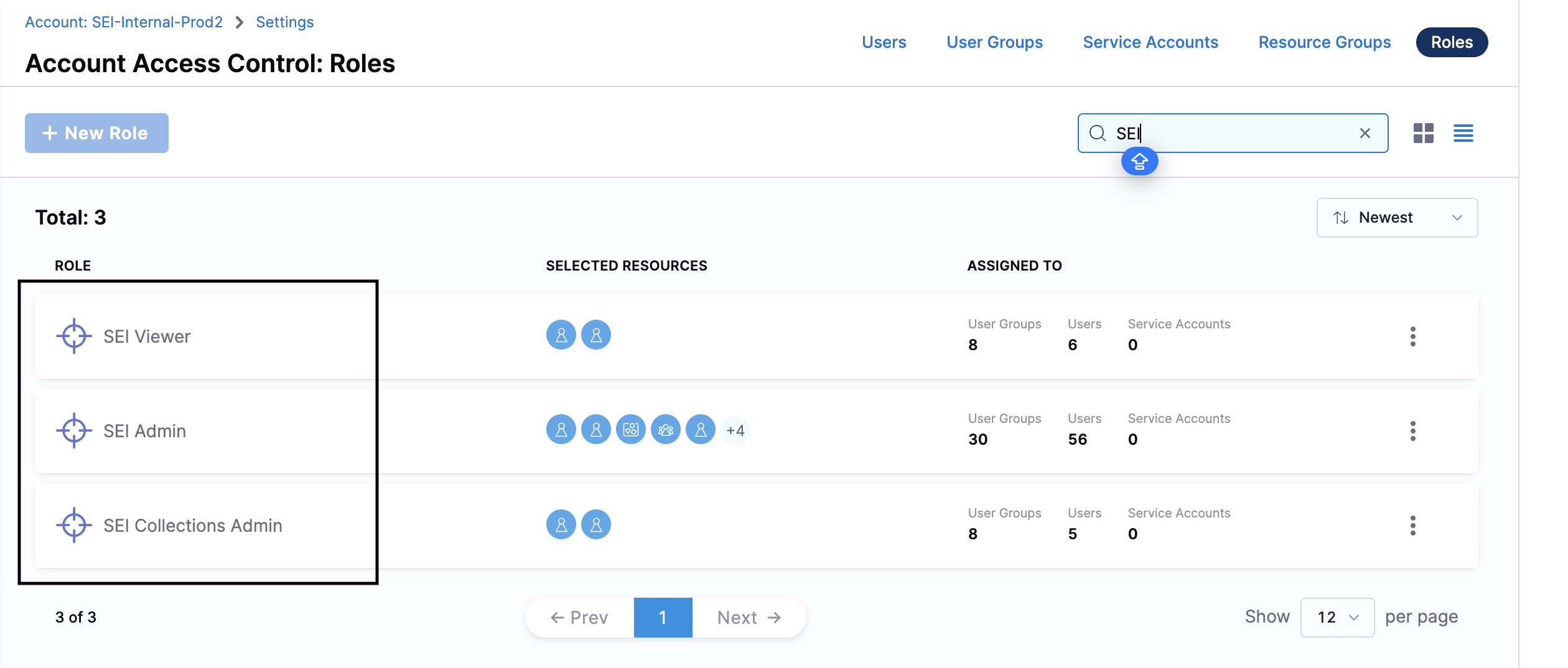 This role exists at the Account level and has CRUD-level permissions to all SEI resources (For ex: Configuration settings, Insights, and Collections) and entities. However, this level of access is granted only when the role is associated with a resource group that contains permission for all SEI resources.