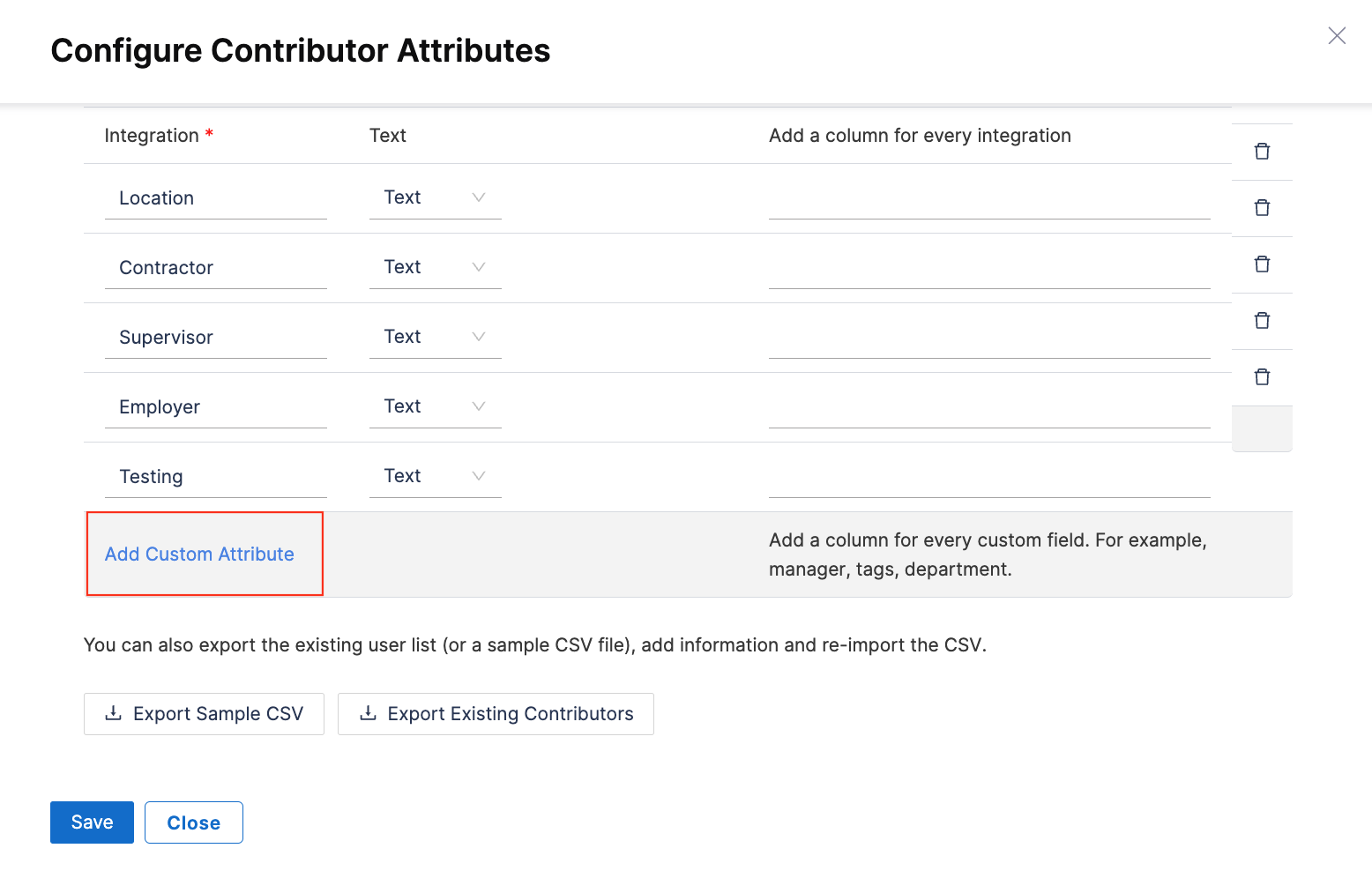 Select the Settings (wrench) icon to edit contributor attributes. By default, contributors only include a Name and Email. You can use attributes as dynamic filters for contributor-based Collections. Therefore, you might find it useful to add custom attributes, such as roles, team names, departments, supervisors, or other designations.