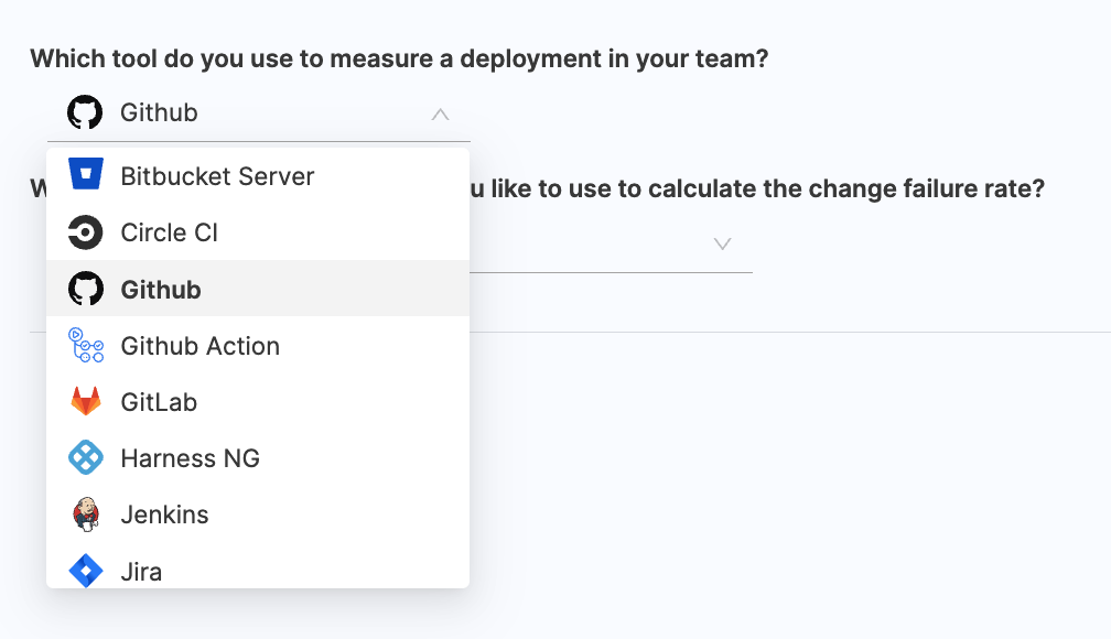 - Choose BitBucket / BitBucker Server as the tool that you use to measure change failure rate in your team.