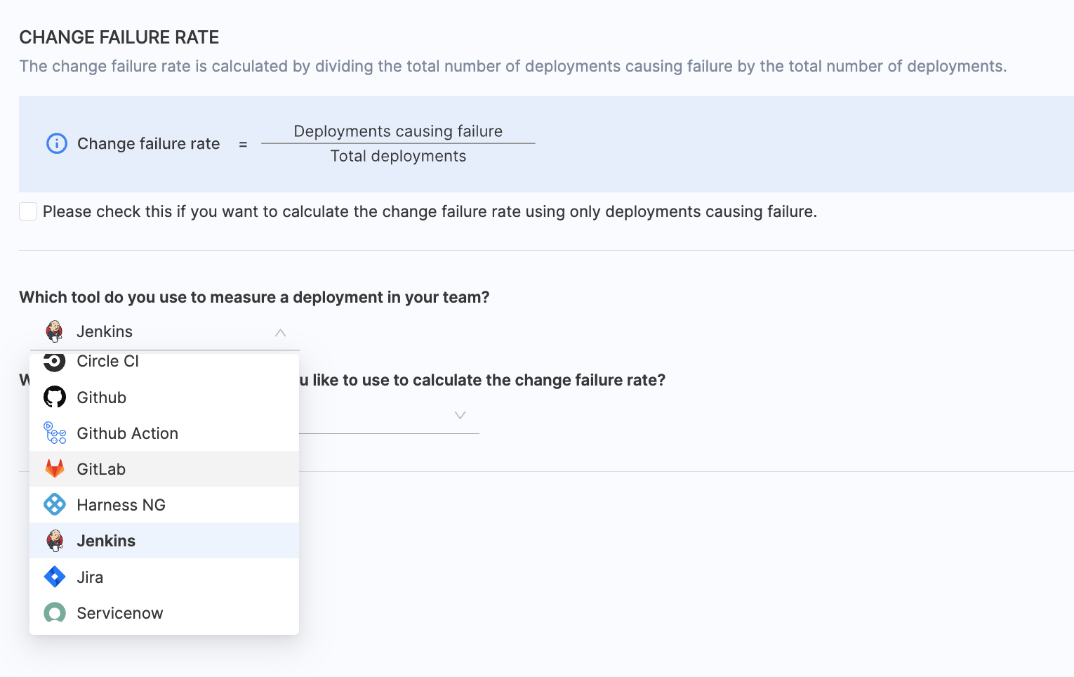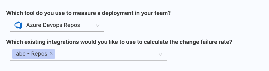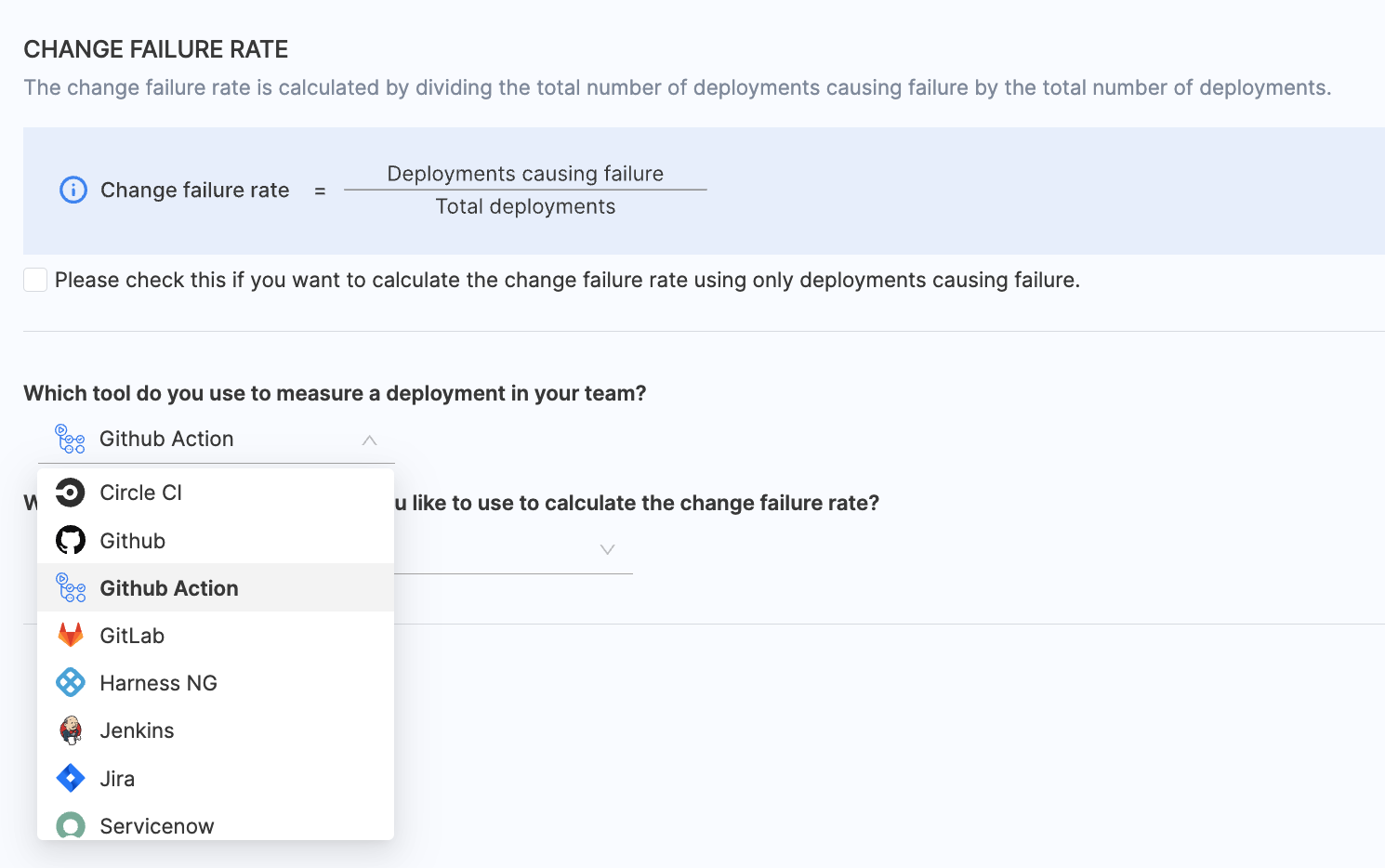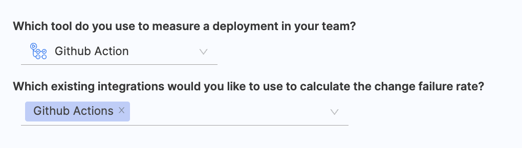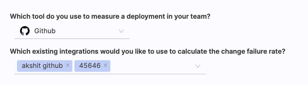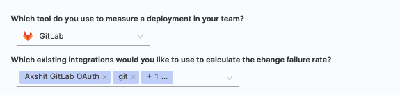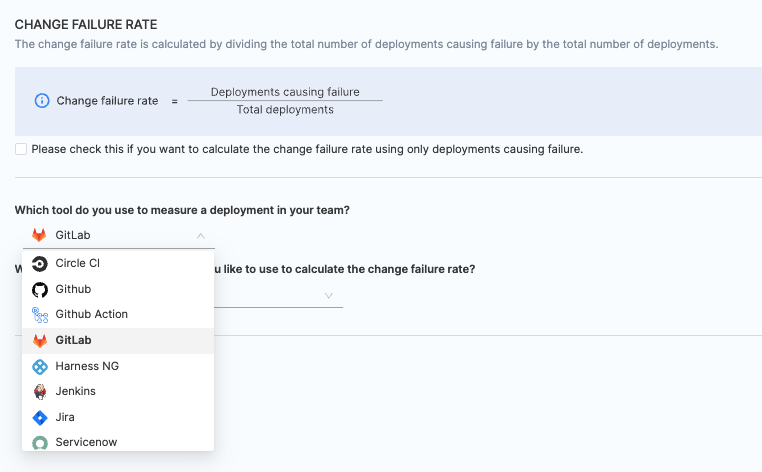 - Choose any existing integrations you want to utilize for calculating the change failure rate.