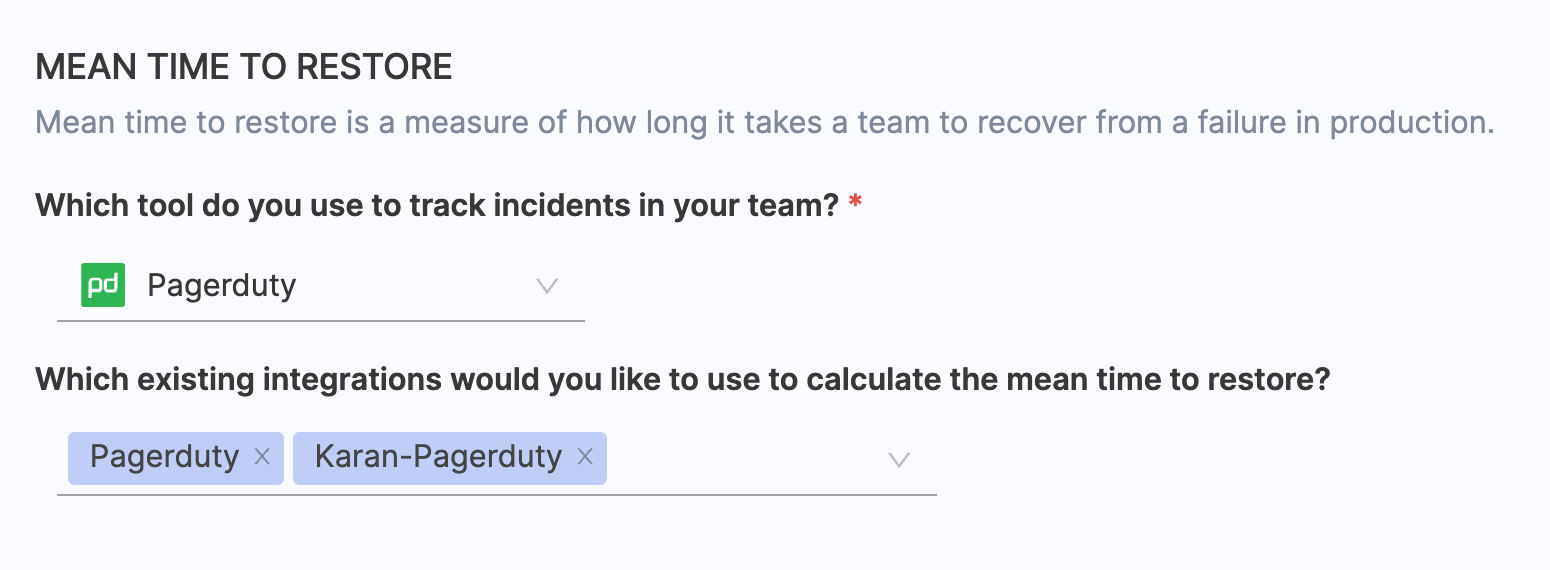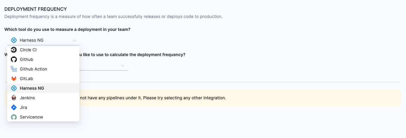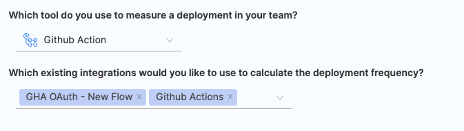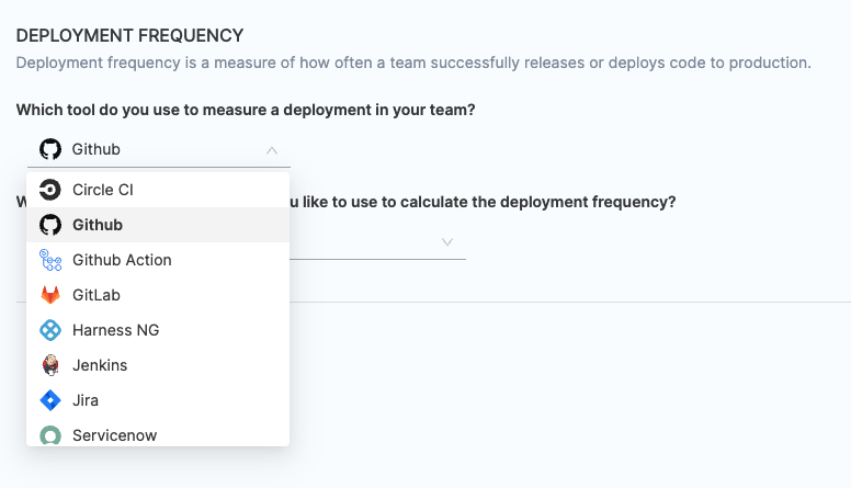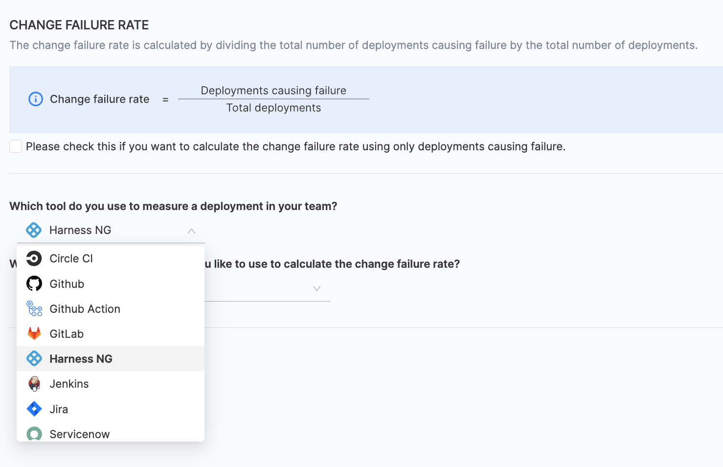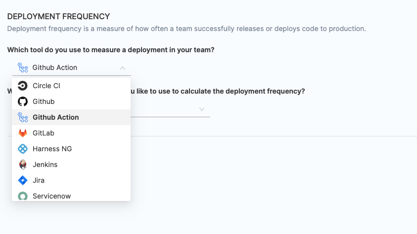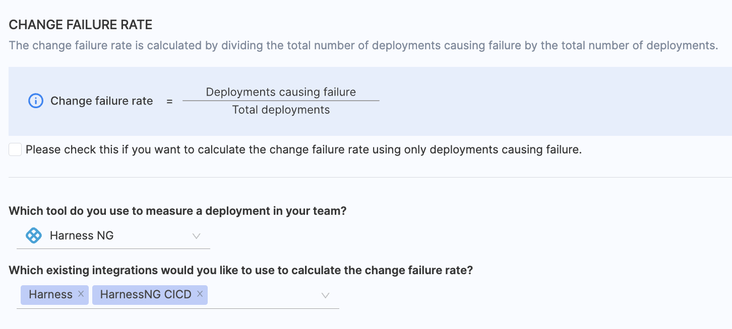- Choose any existing integrations you want to utilize for calculating the change failure rate.