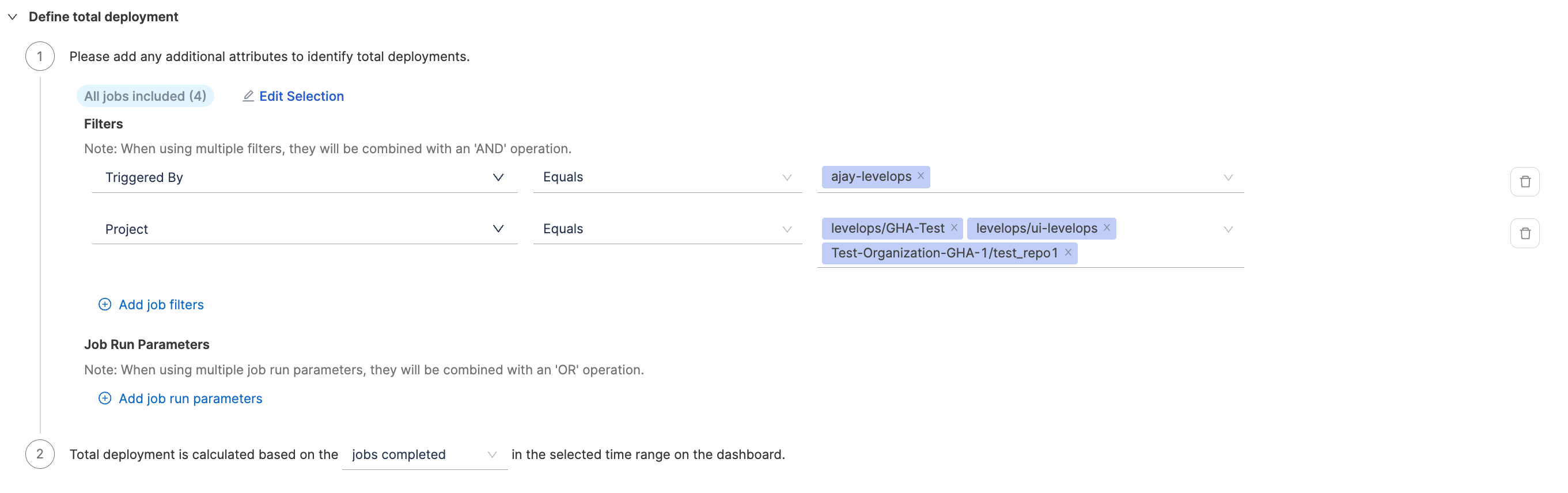 - Define job run parameters in key-value pairs. When using multiple job run parameters, they will be combined with an 'OR' operation. Similarly describe what defines a deployment causing failure based on the jobs completed or jobs started events in the selected time range.