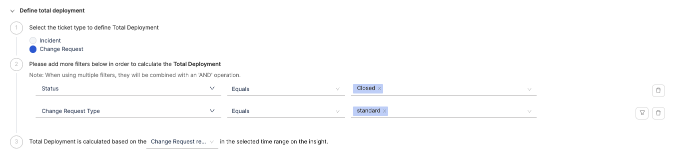 Define how total deployments should be tracked: - Change Request Resolved: Tracks total deployments based on when change requests are resolved (e.g., status changes to Closed).