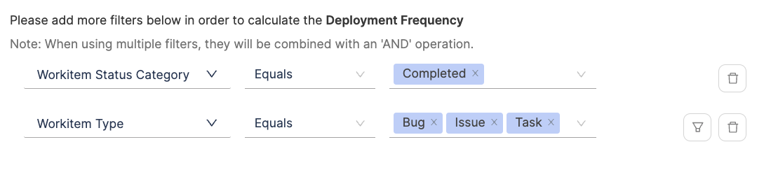 - Configure additional attributes to define deployments that result in failure or total deployments. When applying multiple filters, they will be combined using an 'AND' operation. A failed Deployment can be a hotfix or a deployment that led to failure.