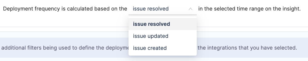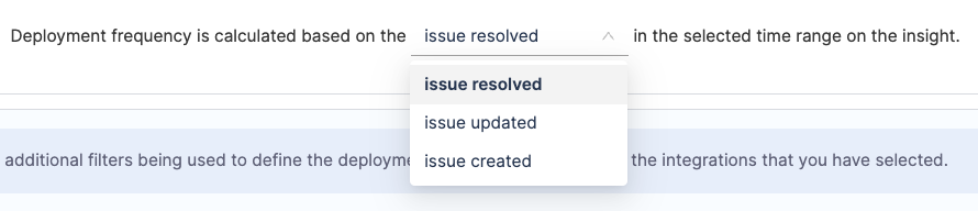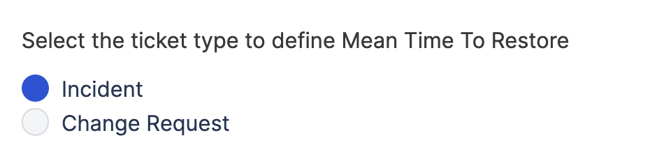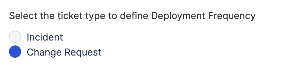 Select the ticket type for deployment frequency tracking: - Incidents is the recommended option for measuring deployment causing failure.