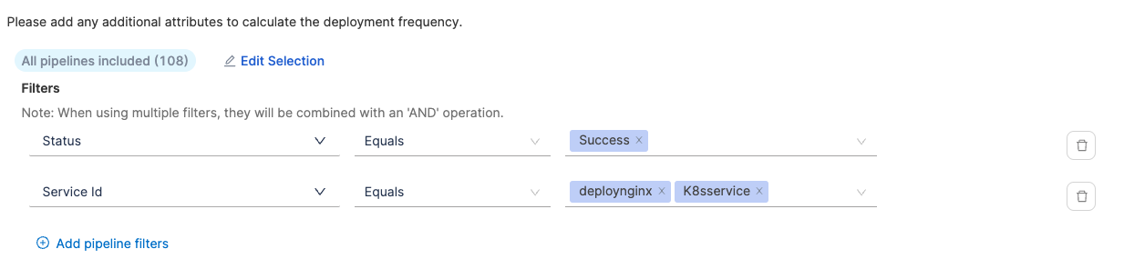 - Define additional attributes to identify deployments causing failure and total deployments. When using multiple filters, they will be combined with an 'AND' operation.