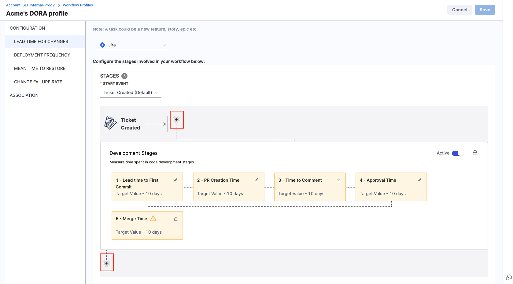- The workflow definition includes pre-configured development stages based on SCM activity, such as PR Creation Time, Time to Comment and more.