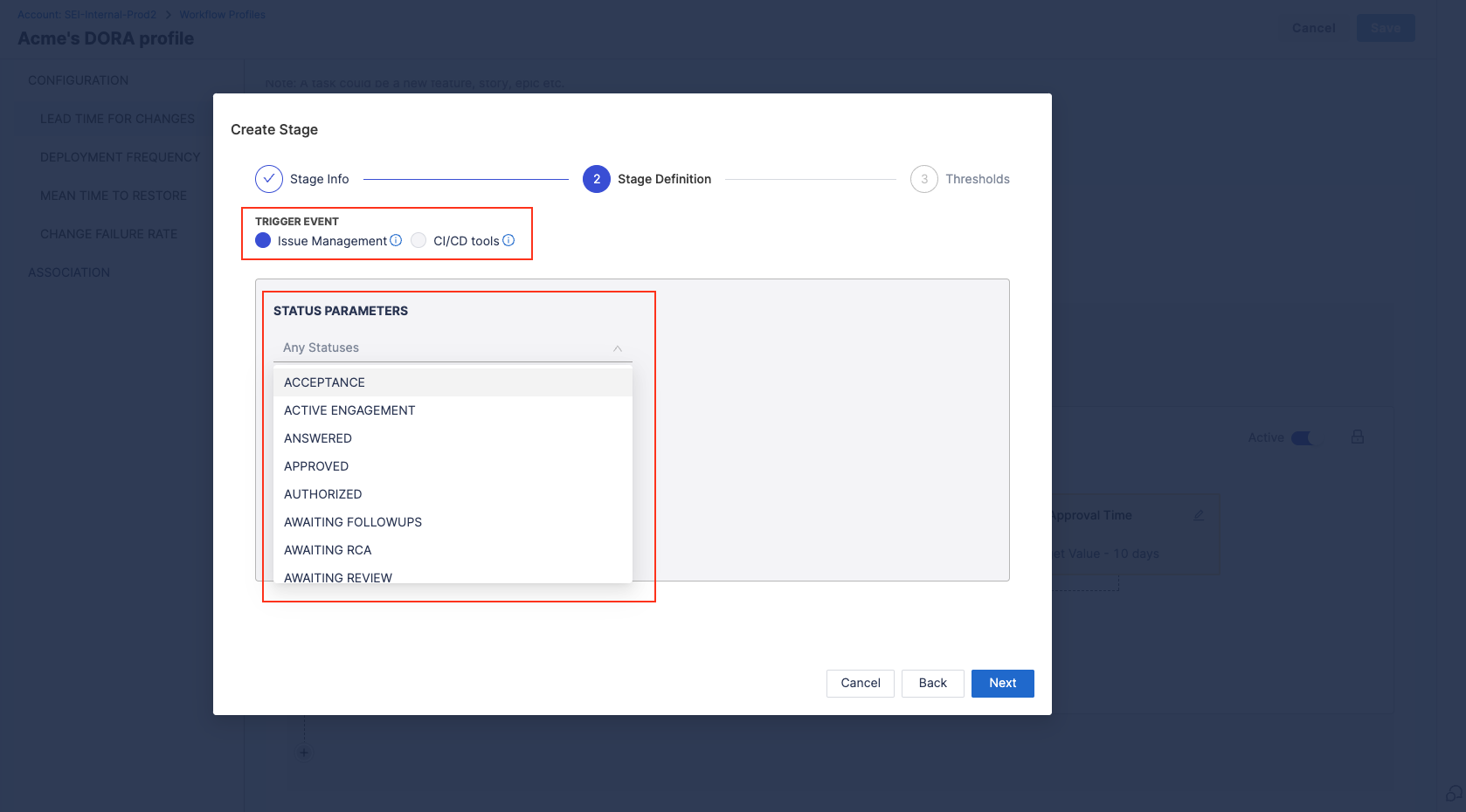 - Define the Stage Trigger Event (e.g., Issue Management) and map the stage to statuses in your issue management system.