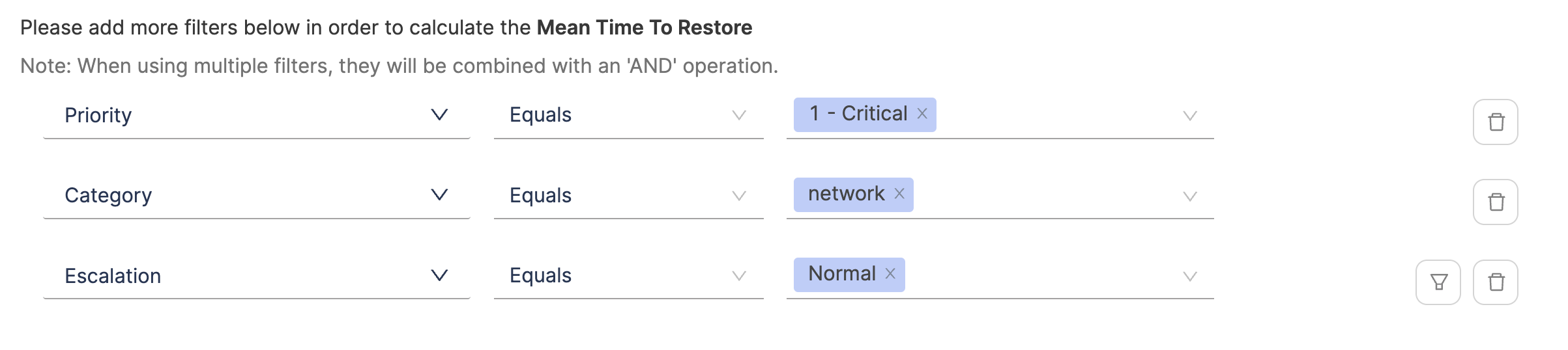 Refine the calculation criteria by specifying filters: - Use filters to include or exclude tickets based on specific fields, conditions, and values in your ServiceNow account.