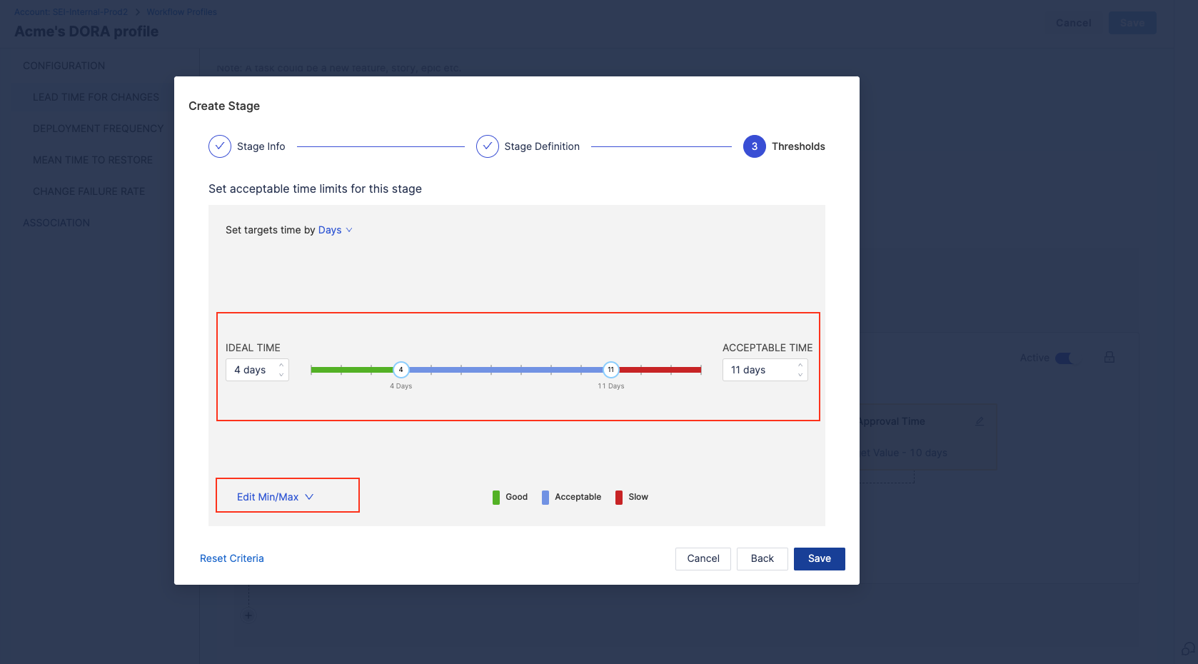 - Define the acceptable time limits Ideal Time, Minimum Time, and Maximum Timefor the CI Build Time.