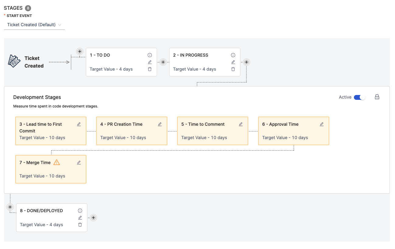 - Review the pre populated Development Stages and edit them, if necessary. These stages represent the progression of code in your SCM tool, from first commit to PR merge.