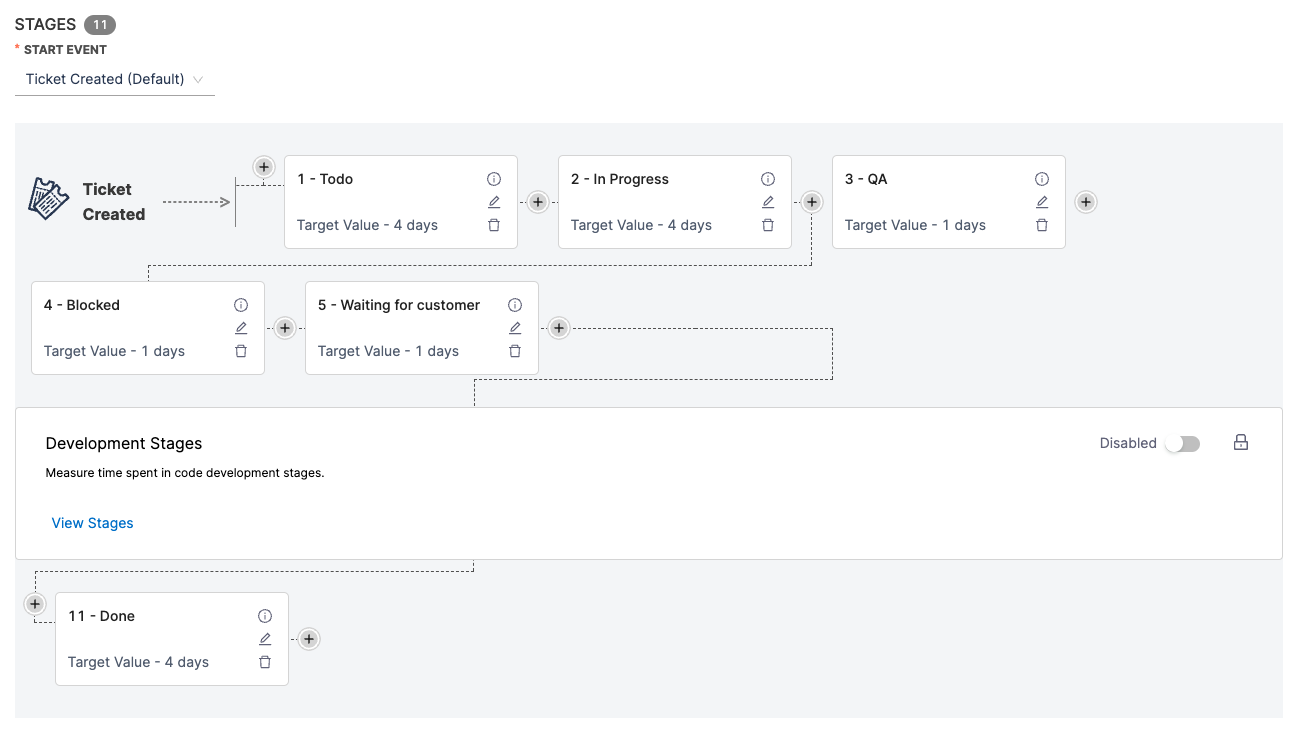 - Under lead time, select Stages, and set the Start Event to Ticket Created.