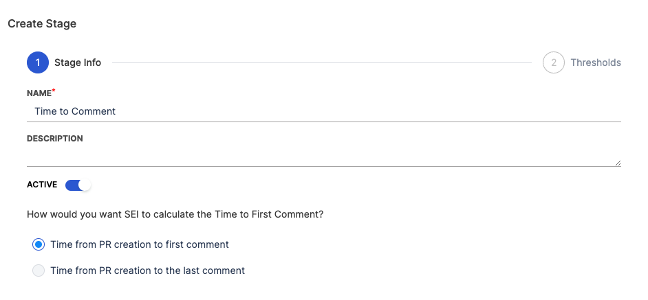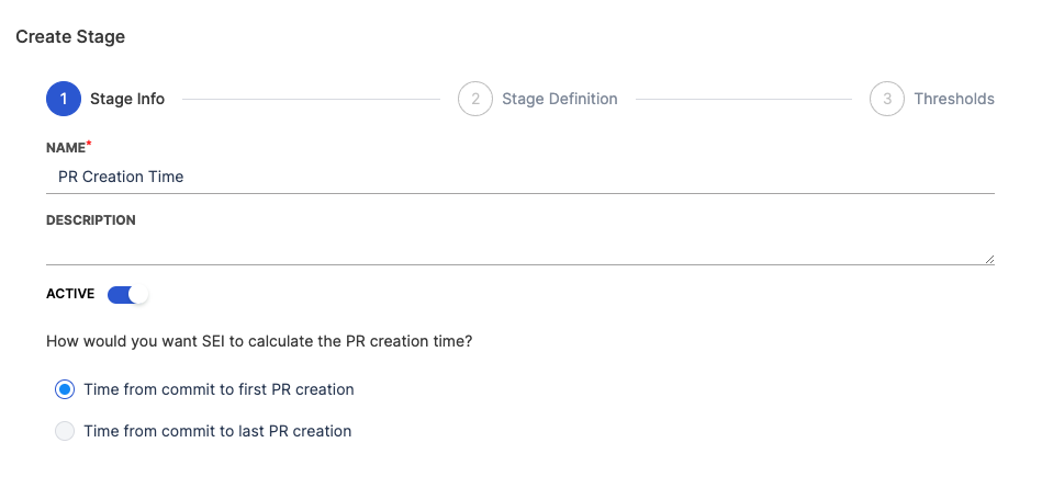 - Review the pre populated Stages that represent the PR lifecycle, from PR creation to merge. You can edit, add, and remove stages as needed. You can edit the data or fields that drive each stage, set time range goals, and more.