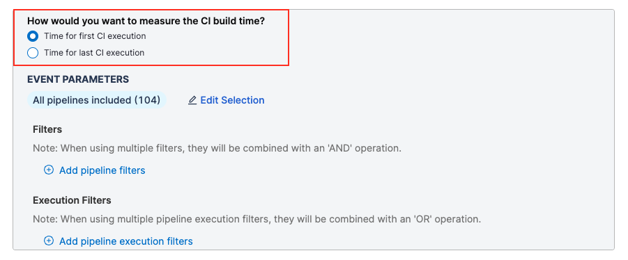 Specify the event parameters. This is useful to filter the data that should be used in the calculation. - All Pipelines Included: Includes all deployment pipelines associated with the project or team.