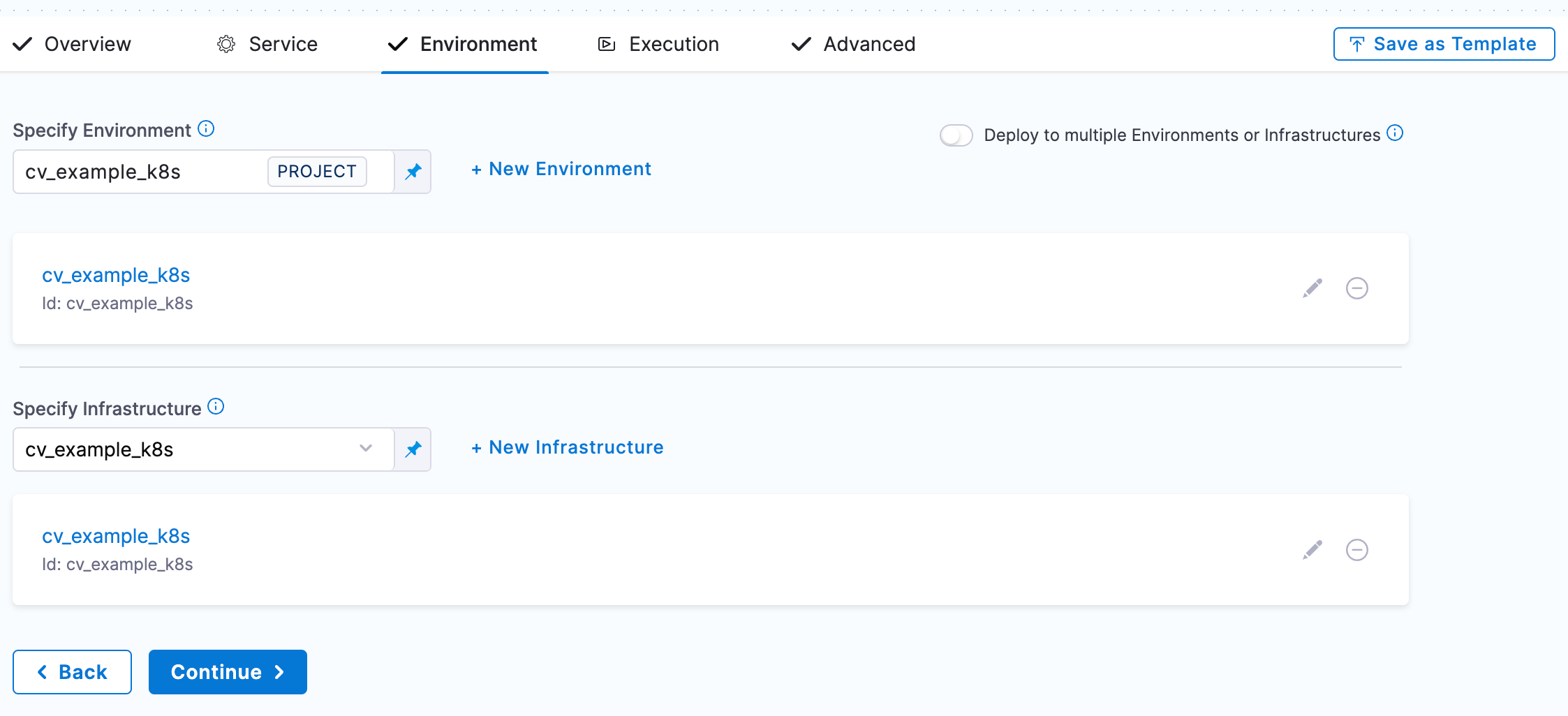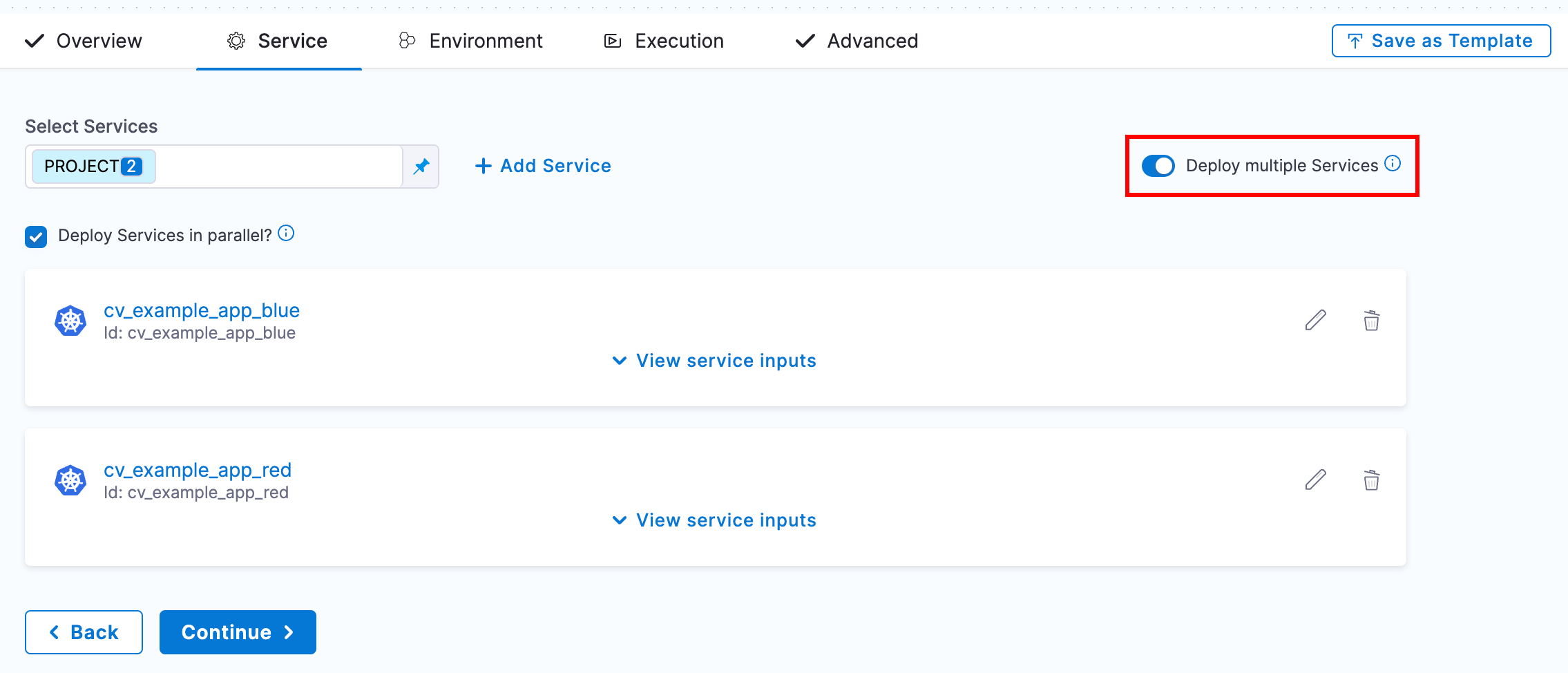 For the inputs under Service and Environment use <+service.identifier> and  <+env.environmentRef> respectively.