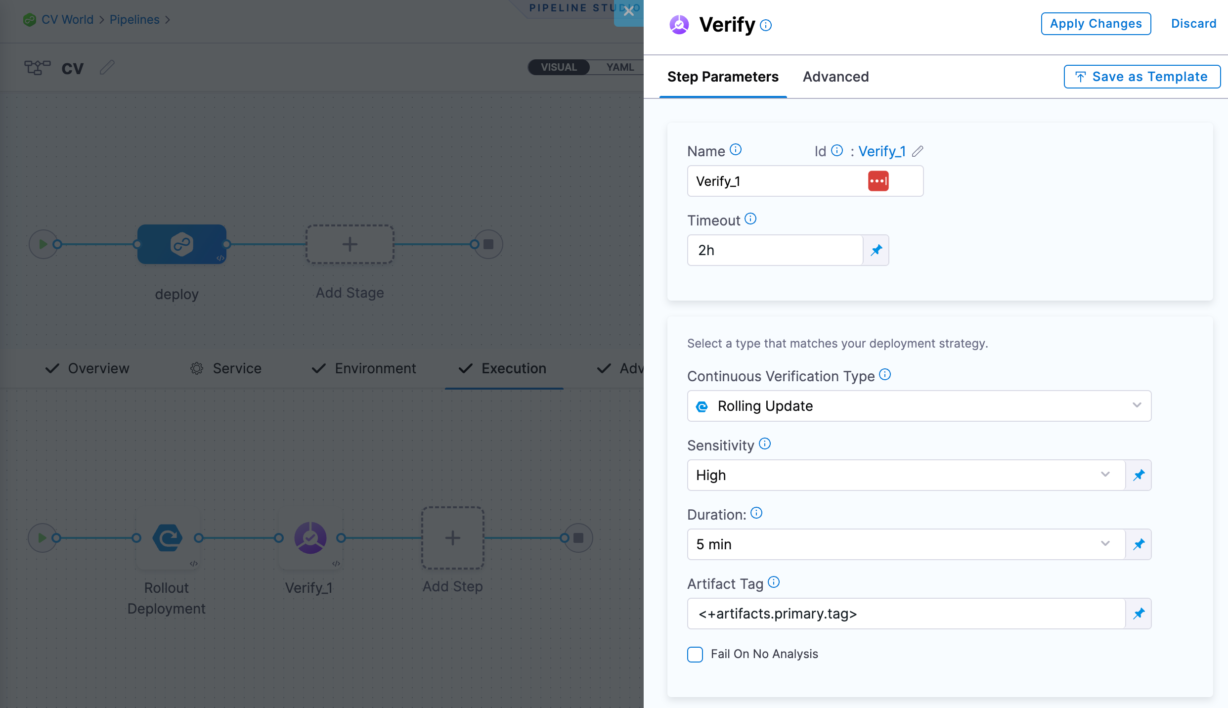For the execution wizard select your deployment type (we will use rolling for this example). Now after the deployment step add a verify step and configure it for your deployment type and add the desired verification settings.