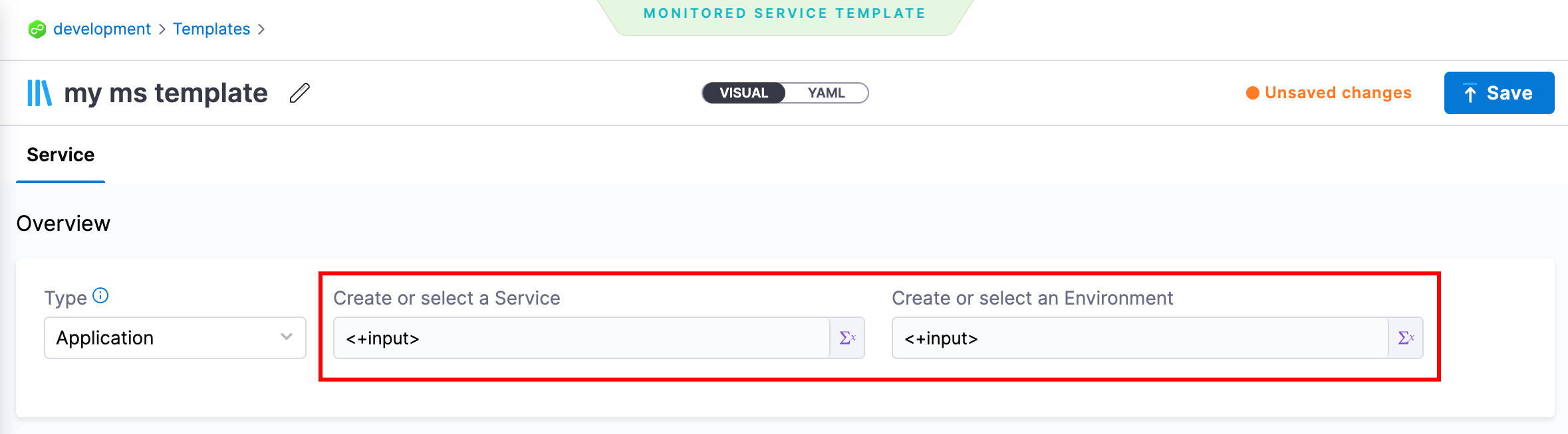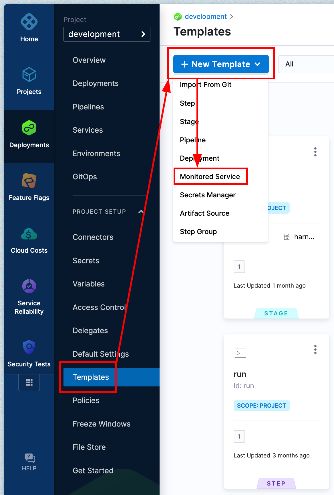 Start by going to the CD module, under project setup go to Templates, and then under + New Template select Monitored Service.
