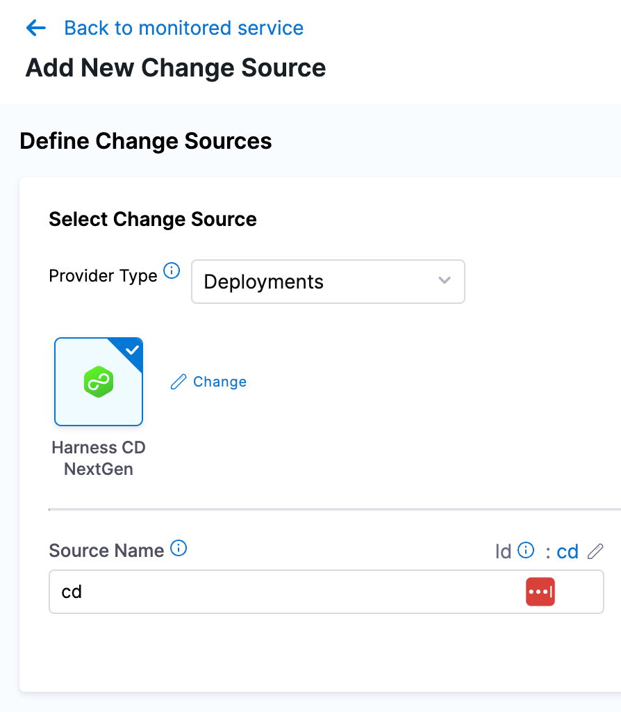 Click + Add New Change Source, select Deployment for the provider type, select Harness CD NextGen, and then give this source a name.