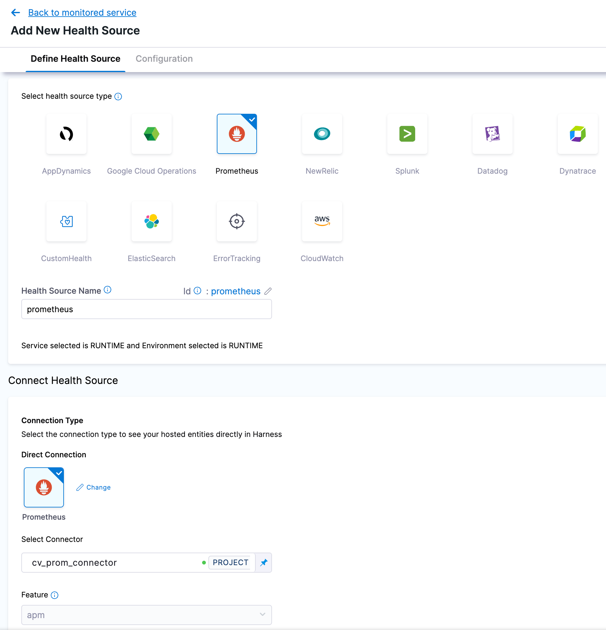 Click + Add New Health Source, select your health source (prometheus in this example), give it a name, and finally select the connector for this source.