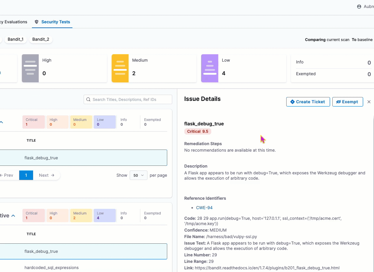 Bandit scan results have been enhanced. When you open the Details pane for a detected issue, the Raw Details JSON now includes links to further information under _rawIssueCwe : linkand_rawMoreInfo. (STO-5422)