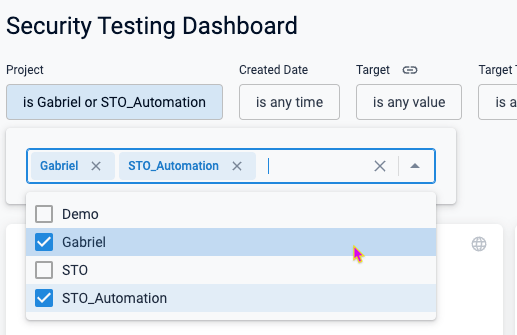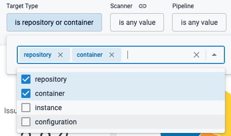 The Security Testing Dashboard includes a new set of filters for drilling down into specific issues by project, creation date, scanner, target, pipeline, severity, and so on. You can drill down to a set of relevant issues and then click on a pie slice, chart element, or other UI element to view details on the relevant issues. (STO-5329) Note the following: -